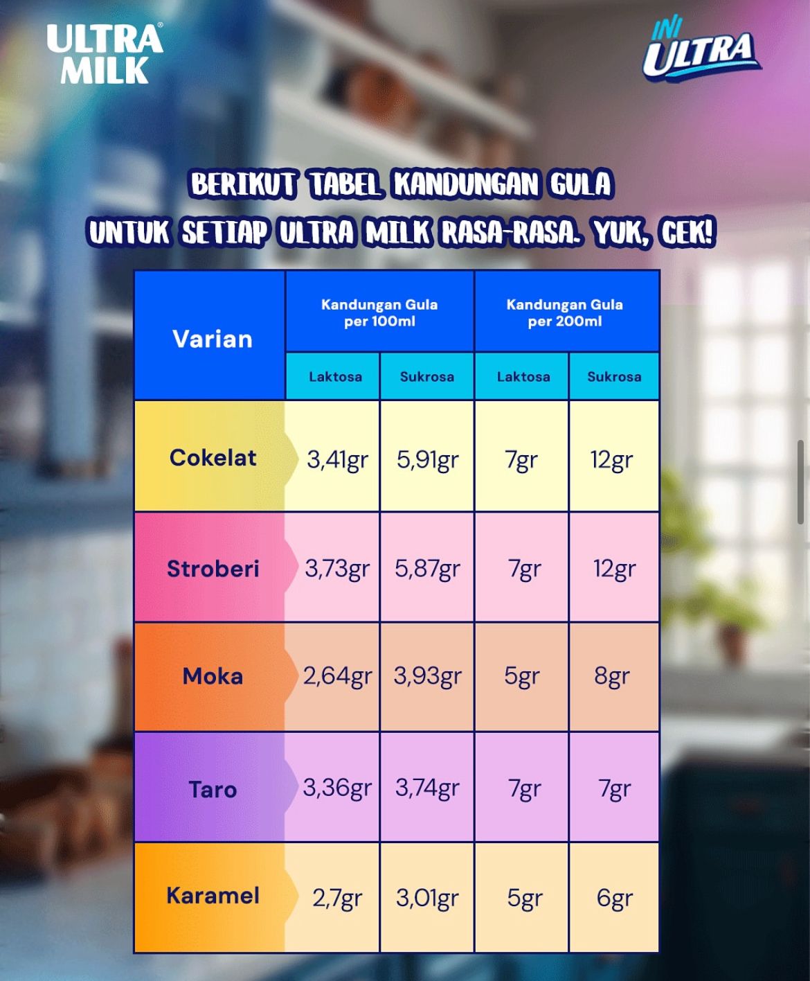 Susu Ultra Milk rasa coklat ukuran 200 ml mengandung 19 gram gula. Sedangkan Ultra Milk rasa stroberi mengandung 17 gram gula, rasa taro mengandung 14 gram gula, sedangkan rasa karamel mengandung 11 gram gula.